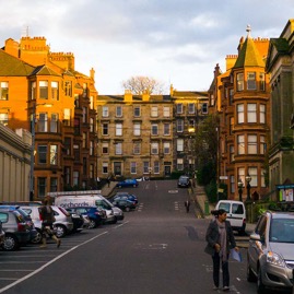 a tenement street off Byres Road in the West End, looking towards the old church which houses the Cottiers Theatre